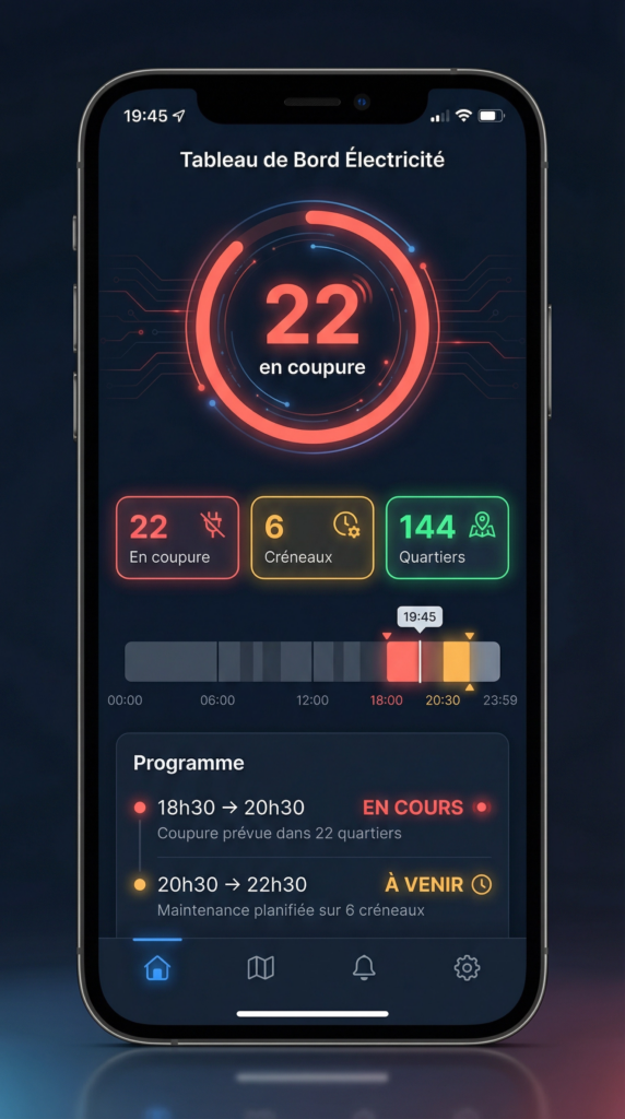 - Savoir en un coup d’œil si votre quartier est touché. Le tableau de bord affiche en temps réel le nombre de quartiers en coupure, les créneaux programmés et une timeline visuelle de la journée. En tapant le nom de votre quartier, vous obtenez instantanément son statut, le programme complet du jour, et un countdown en direct si une coupure est en cours.